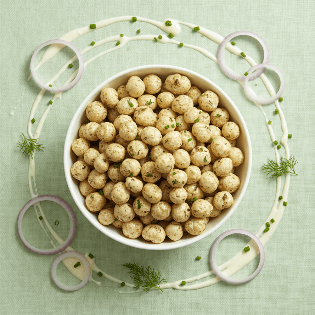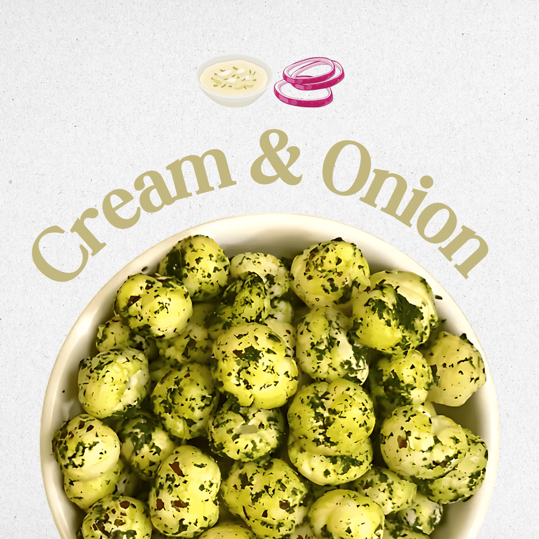 Seasoned with a balanced cream & onion blend — featuring onion powder, dairy-derived or plant-based cream powder, chives, garlic, and a pinch of black pepper — this variant delivers a familiar savory-creamy profile with smooth mouthfeel and crisp texture.