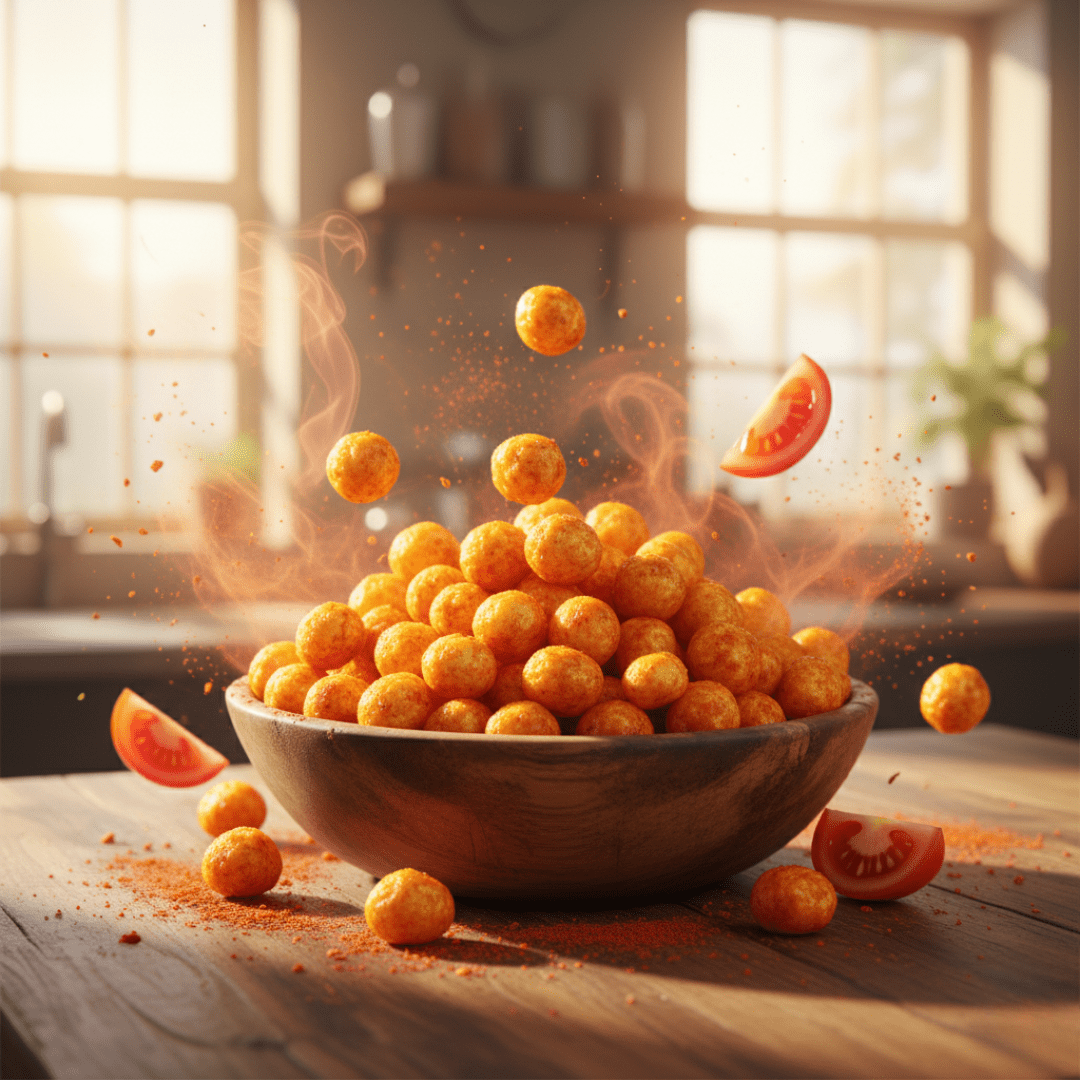 Seasoned with a bright tangy-tomato spice blend — featuring tomato powder, sun-dried tomato, smoked paprika, onion, garlic, and a touch of citric acidity — this variant delivers a familiar tomato-savoury profile with balanced tang, mild sweetness, and crunchy texture.